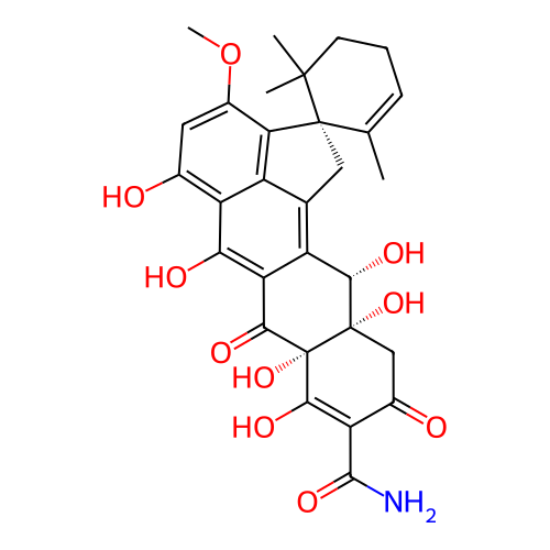 | InChI | InChI=1S/C30H31NO10/c1-11-6-5-7-27(2,3)28(11)9-12-16-18(13(32)8-15(41-4)21(16)28)22(34)20-17(12)23(35)29(39)10-14(33)19(26(31)38)24(36)30(29,40)25(20)37/h6,8,23,32,34-36,39-40H,5,7,9-10H2,1-4H3,(H2,31,38)/t23-,28-,29-,30+/m0/s1 |