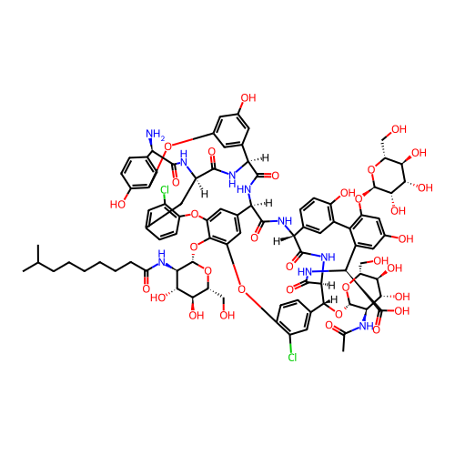 | SMILES | CC(C)CCCCCCC(=O)N[C@@H]1[C@H]([C@@H]([C@H](O[C@H]1OC2=C3C=C4C=C2OC5=C(C=C(C=C5)[C@H]([C@H]6C(=O)N[C@@H](C7=CC(=CC(=C7C8=C(C=CC(=C8)[C@H](C(=O)N6)NC(=O)[C@@H]4NC(=O)[C@@H]9C1=CC(=CC(=C1)O)OC1=C(C=CC(=C1)[C@H](C(=O)N[C@H](CC1=CC(=C(O3)C=C1)Cl)C(=O)N9)N)O)O)O[C@@H]1[C@H]([C@H]([C@@H]([C@H](O1)CO)O)O)O)O)C(=O)O)O[C@H]1[C@@H]([C@H]([C@@H]([C@H](O1)CO)O)O)NC(=O)C)Cl)CO)O)O |