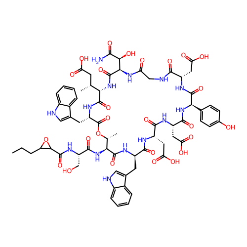 | SMILES | CCCC1C(O1)C(=O)N[C@@H](CO)C(=O)N[C@H]2[C@H](OC(=O)[C@@H](NC(=O)[C@@H](NC(=O)[C@H](NC(=O)CNC(=O)[C@@H](NC(=O)[C@H](NC(=O)[C@@H](NC(=O)[C@@H](NC(=O)[C@H](NC2=O)CC3=CNC4=CC=CC=C43)CC(=O)O)CC(=O)O)C5=CC=C(C=C5)O)CC(=O)O)[C@@H](C(=O)N)O)[C@H](C)CC(=O)O)CC6=CNC7=CC=CC=C76)C |