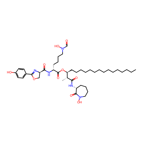 | SMILES | CCCCCCCCCCCCCCC[C@H](OC(=O)[C@@H](CCCCN(O)C=O)NC(=O)[C@H]1COC(C2=CC=C(O)C=C2)=N1)[C@@H](C)C(=O)N[C@@H]1CCCCN(O)C1=O |