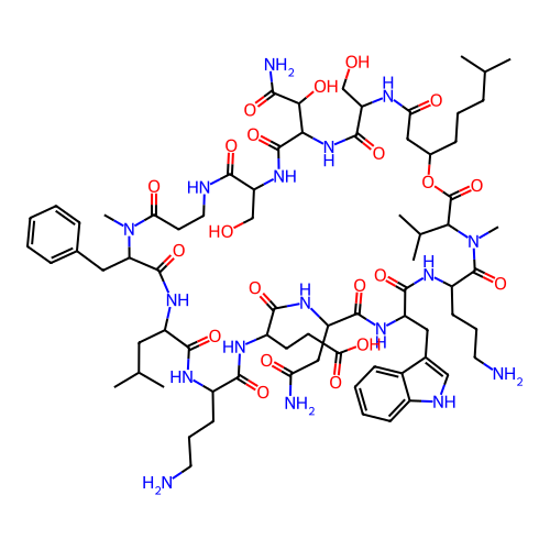 | SMILES | CC(C)CCCC1CC(=O)NC(C(=O)NC(C(=O)NC(C(=O)NCCC(=O)N(C(C(=O)NC(C(=O)NC(C(=O)NC(C(=O)NC(C(=O)NC(C(=O)NC(C(=O)N(C(C(=O)O1)C(C)C)C)CCCN)CC2=CNC3=CC=CC=C32)CC(=O)N)CCC(=O)O)CCCN)CC(C)C)CC4=CC=CC=C4)C)CO)C(C(=O)N)O)CO |