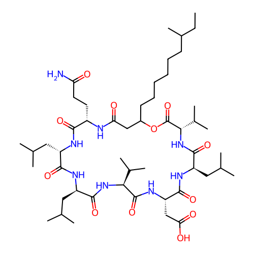 | SMILES | CCC(C)CCCCCCC1CC(=O)N[C@H](C(=O)N[C@H](C(=O)N[C@@H](C(=O)N[C@H](C(=O)N[C@H](C(=O)N[C@@H](C(=O)N[C@H](C(=O)O1)C(C)C)CC(C)C)CC(=O)O)C(C)C)CC(C)C)CC(C)C)CCC(=O)N |