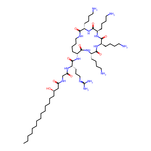 | SMILES | CCCCCCCCCCCCCC[C@H](CC(=O)NCC(=O)N[C@@H](CCCN=C(N)N)C(=O)N[C@@H]1CCCCNC(=O)[C@@H](NC(=O)[C@H](NC(=O)[C@H](NC(=O)[C@@H](NC1=O)CCCCN)CCCCN)CCCCN)CCCCN)O |