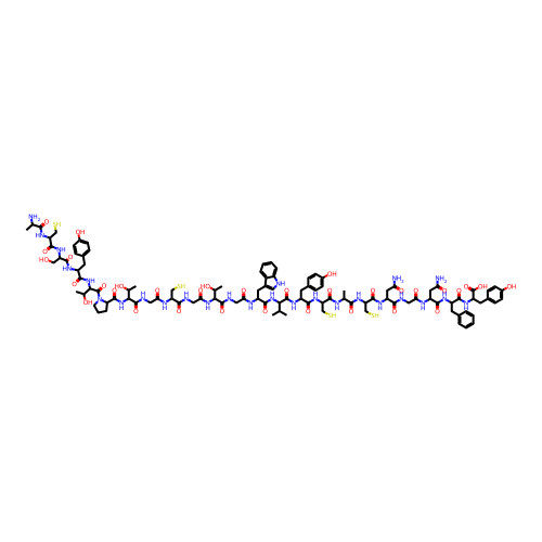 InChI=1S/C106H144N26O33S4/c1-49(2)84(104(162)122-66(33-56-19-25-60(137)26-20-56)93(151)127-74(46-167)98(156)115-51(4)89(147)126-76(48-169)99(157)121-69(37-78(108)140)90(148)111-40-80(142)117-70(38-79(109)141)94(152)119-65(32-55-14-9-8-10-15-55)92(150)123-71(106(164)165)35-58-23-29-62(139)30-24-58)129-96(154)68(36-59-39-110-64-17-12-11-16-63(59)64)116-81(143)41-113-102(160)85(52(5)134)128-83(145)43-112-91(149)73(45-166)118-82(144)42-114-103(161)86(53(6)135)130-101(159)77-18-13-31-132(77)105(163)87(54(7)136)131-95(153)67(34-57-21-27-61(138)28-22-57)120-97(155)72(44-133)124-100(158)75(47-168)125-88(146)50(3)107/h8-12,14-17,19-30,39,49-54,65-77,84-87,110,133-139,166-169H,13,18,31-38,40-48,107H2,1-7H3,(H2,108,140)(H2,109,141)(H,111,148)(H,112,149)(H,113,160)(H,114,161)(H,115,156)(H,116,143)(H,117,142)(H,118,144)(H,119,152)(H,120,155)(H,121,157)(H,122,162)(H,123,150)(H,124,158)(H,125,146)(H,126,147)(H,127,151)(H,128,145)(H,129,154)(H,130,159)(H,131,153)(H,164,165) |