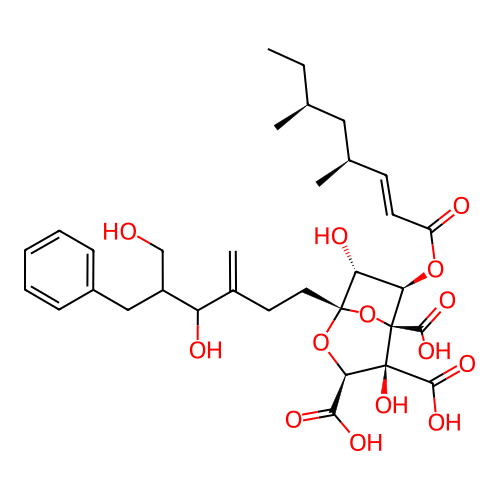 | SMILES | CC[C@H](C)C[C@H](C)/C=C/C(=O)O[C@@H]1[C@H]([C@]2(O[C@@H]([C@]([C@@]1(O2)C(=O)O)(C(=O)O)O)C(=O)O)CCC(=C)C(C(CC3=CC=CC=C3)CO)O)O |