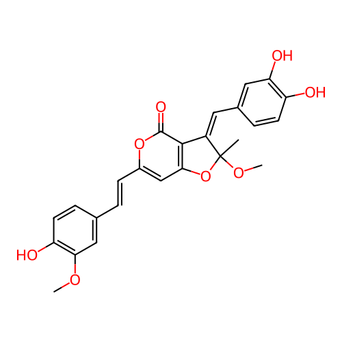 | InChI | InChI=1S/C25H22O8/c1-25(31-3)17(10-15-6-8-18(26)20(28)11-15)23-22(33-25)13-16(32-24(23)29)7-4-14-5-9-19(27)21(12-14)30-2/h4-13,26-28H,1-3H3/b7-4+,17-10- |