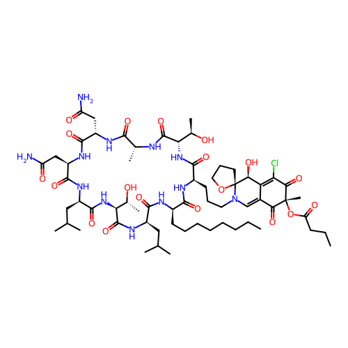 | SMILES | CCCCCCCC[C@H]1NC(=O)[C@@H](CC(C)C)NC(=O)[C@H]([C@@H](C)O)NC(=O)[C@@H](CC(C)C)NC(=O)[C@@H](CC(N)=O)NC(=O)[C@H](CC(N)=O)NC(=O)[C@@H](C)NC(=O)[C@H]([C@@H](C)O)NC(=O)[C@@H](CCCN2C=C3C(=O)[C@@](C)(OC(=O)CCC)C(=O)C(Cl)=C3[C@H](O)[C@]23CCCO3)NC1=O |