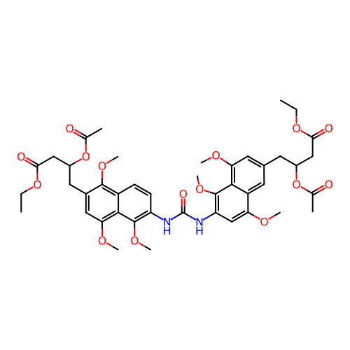 | InChI | InChI=1S/C43H52N2O15/c1-11-57-36(48)20-27(59-23(3)46)15-25-16-30-33(51-5)22-32(42(56-10)39(30)34(17-25)52-6)45-43(50)44-31-14-13-29-38(41(31)55-9)35(53-7)19-26(40(29)54-8)18-28(60-24(4)47)21-37(49)58-12-2/h13-14,16-17,19,22,27-28H,11-12,15,18,20-21H2,1-10H3,(H2,44,45,50) |