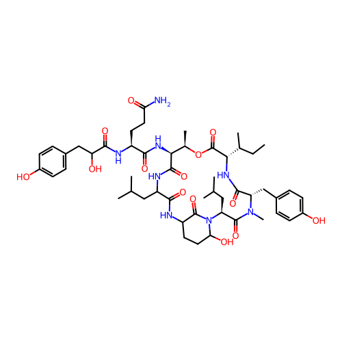| SMILES | CCC(C)[C@H]1C(=O)O[C@@H]([C@@H](C(=O)NC(C(=O)NC2CCC(N(C2=O)[C@H](C(=O)N([C@H](C(=O)N1)CC3=CC=C(C=C3)O)C)CC(C)C)O)CC(C)C)NC(=O)[C@H](CCC(=O)N)NC(=O)C(CC4=CC=C(C=C4)O)O)C |