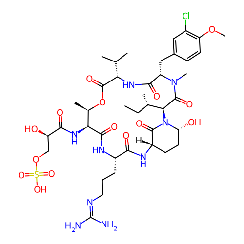| SMILES | CC[C@H](C)[C@H]1C(=O)N([C@H](C(=O)N[C@H](C(=O)O[C@@H]([C@@H](C(=O)N[C@H](C(=O)N[C@H]2CC[C@H](N1C2=O)O)CCCN=C(N)N)NC(=O)[C@@H](COS(=O)(=O)O)O)C)C(C)C)CC3=CC(=C(C=C3)OC)Cl)C |