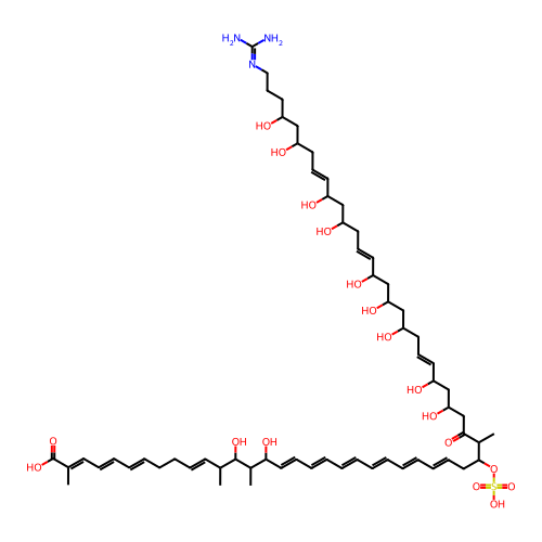 | SMILES | CC(/C=C/CC/C=C/C=C/C=C(\C)/C(=O)O)C(C(C)C(/C=C/C=C/C=C/C=C/C=C/C=C/CC(C(C)C(=O)CC(CC(/C=C/CC(CC(CC(/C=C/CC(CC(/C=C/CC(CC(CCCN=C(N)N)O)O)O)O)O)O)O)O)O)OS(=O)(=O)O)O)O |