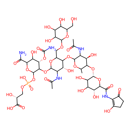 | SMILES | CC1C([C@@H](C(C(O1)OC2[C@@H](C(C(OC2COC3C(C(C(C(O3)CO)O)O)O)OC4[C@H](C(C(OC4OP(=O)(O)OC[C@H](C(=O)O)O)C(=O)N)O)OC(=O)N)NC(=O)C)O)NC(=O)C)O)O[C@H]5C(C([C@H](C(O5)C(=O)NC6=C(CCC6=O)O)O)O)O |