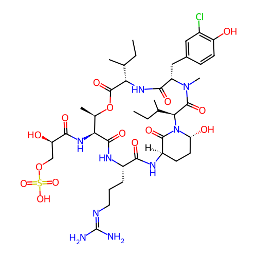 | SMILES | CCC(C)[C@H]1C(=O)O[C@@H]([C@@H](C(=O)N[C@H](C(=O)N[C@@H]2CC[C@H](N(C2=O)[C@H](C(=O)N([C@H](C(=O)N1)CC3=CC(=C(C=C3)O)Cl)C)C(C)CC)O)CCCN=C(N)N)NC(=O)[C@@H](COS(=O)(=O)O)O)C |