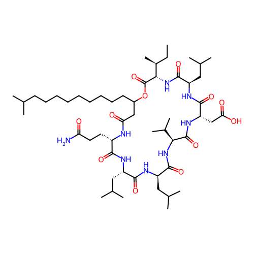 | SMILES | CC[C@H](C)[C@H]1C(=O)OC(CC(=O)N[C@H](C(=O)N[C@H](C(=O)N[C@@H](C(=O)N[C@H](C(=O)N[C@H](C(=O)N[C@@H](C(=O)N1)CC(C)C)CC(=O)O)C(C)C)CC(C)C)CC(C)C)CCC(=O)N)CCCCCCCCCC(C)C |