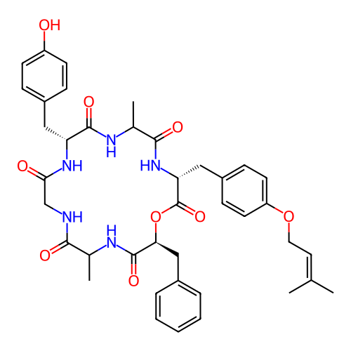 | SMILES | CC1C(=O)N[C@@H](C(=O)O[C@H](C(=O)NC(C(=O)NCC(=O)N[C@@H](C(=O)N1)CC2=CC=C(C=C2)O)C)CC3=CC=CC=C3)CC4=CC=C(C=C4)OCC=C(C)C |