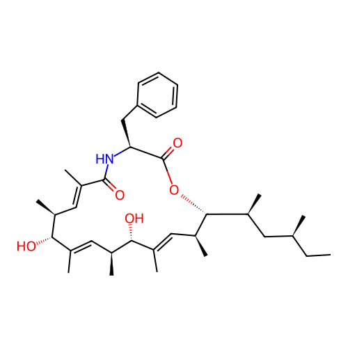 | SMILES | CC[C@H](C)C[C@H](C)[C@@H]1[C@H](/C=C(/[C@H]([C@H](/C=C(/[C@@H]([C@H](/C=C(/C(=O)N[C@H](C(=O)O1)CC2=CC=CC=C2)\C)C)O)\C)C)O)\C)C |