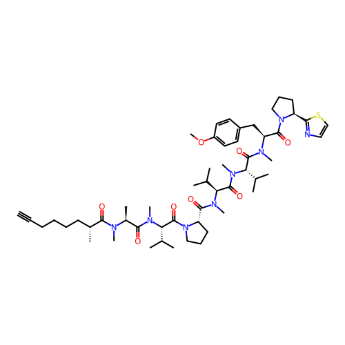 | SMILES | C[C@H](CCCCC#C)C(=O)N(C)[C@@H](C)C(=O)N(C)[C@@H](C(C)C)C(=O)N1CCC[C@H]1C(=O)N(C)[C@@H](C(C)C)C(=O)N(C)[C@@H](C(C)C)C(=O)N(C)[C@@H](CC2=CC=C(C=C2)OC)C(=O)N3CCC[C@H]3C4=NC=CS4 |