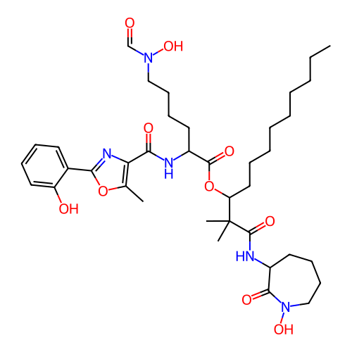 | SMILES | CCCCCCCCCC(C(C)(C)C(=O)NC1CCCCN(C1=O)O)OC(=O)C(CCCCN(C=O)O)NC(=O)C2=C(OC(=N2)C3=CC=CC=C3O)C |