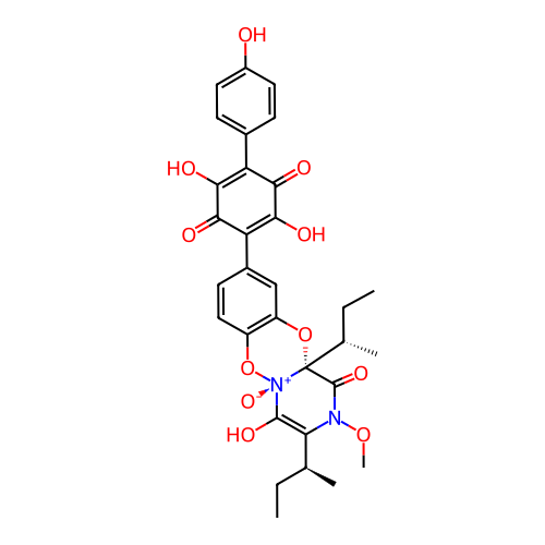 | SMILES | CC[C@H](C)C1=C(O)[N@+]2([O-])OC3=C(C=C(C4=C(O)C(=O)C(C5=CC=C(O)C=C5)=C(O)C4=O)C=C3)O[C@]2([C@@H](C)CC)C(=O)N1OC |