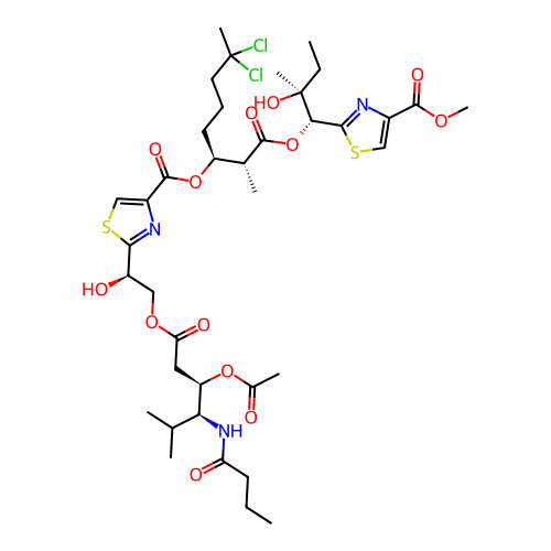 | SMILES | CCCC(=O)N[C@H]([C@@H](CC(=O)OC[C@H](C1=NC(=CS1)C(=O)O[C@@H](CCCC(C)(Cl)Cl)[C@@H](C)C(=O)O[C@@H](C2=NC(=CS2)C(=O)OC)[C@](C)(CC)O)O)OC(=O)C)C(C)C |