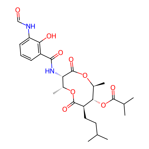 | InChI | InChI=1S/C26H36N2O9/c1-13(2)10-11-18-22(37-24(32)14(3)4)16(6)36-26(34)20(15(5)35-25(18)33)28-23(31)17-8-7-9-19(21(17)30)27-12-29/h7-9,12-16,18,20,22,30H,10-11H2,1-6H3,(H,27,29)(H,28,31)/t15-,16+,18-,20+,22+/m1/s1 |