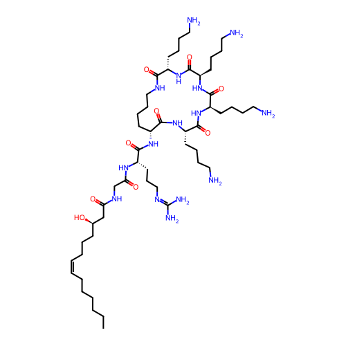 | SMILES | CCCCCC/C=C\CCC[C@H](CC(=O)NCC(=O)N[C@@H](CCCN=C(N)N)C(=O)N[C@@H]1CCCCNC(=O)[C@@H](NC(=O)[C@H](NC(=O)[C@H](NC(=O)[C@@H](NC1=O)CCCCN)CCCCN)CCCCN)CCCCN)O |