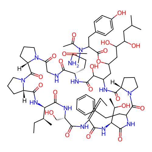 | SMILES | CC[C@H](C)[C@@H]1C(=O)N[C@H](C(=O)N/C(=C/C)/C(=O)N[C@H](C(=O)NC(C(=O)N2CCC[C@H]2C(=O)NC(C(C(=O)N[C@H](C(=O)NCC(=O)N3CCC[C@H]3C(=O)N4CCC[C@H]4C(=O)N1)CCC(=O)N)O)CC(CC(C(CC(C)C)O)O)OC(=O)C(CC5=CC=C(C=C5)O)N(C)C(=O)C)CCC6=CC=CC=C6)[C@@H](C)O)CO |