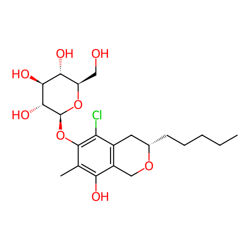 | SMILES | CCCCC[C@H]1CC2=C(CO1)C(=C(C(=C2Cl)O[C@H]3[C@@H]([C@H]([C@@H]([C@H](O3)CO)O)O)O)C)O |