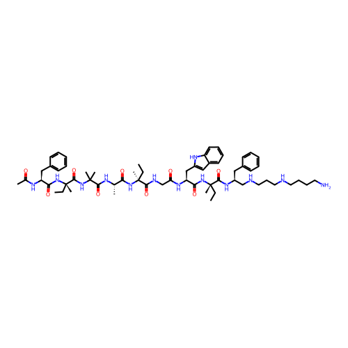 | SMILES | CC[C@@](C)(C(=O)NCC(=O)N[C@@H](CC1=CC2=CC=CC=C2N1)C(=O)N[C@@](C)(CC)C(=O)N[C@@H](CC3=CC=CC=C3)CNCCCNCCCCN)NC(=O)[C@H](C)NC(=O)C(C)(C)NC(=O)[C@](C)(CC)NC(=O)[C@H](CC4=CC=CC=C4)NC(=O)C |