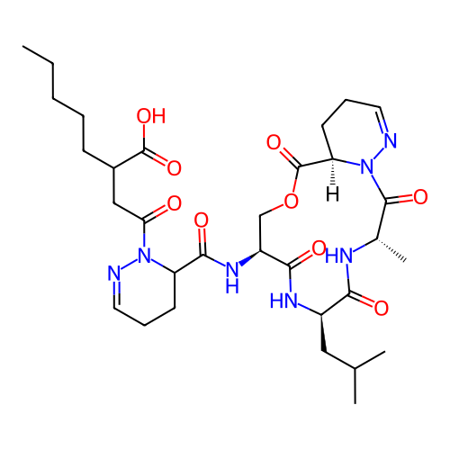 | SMILES | CCCCCC(CC(=O)N1C(CCC=N1)C(=O)N[C@H]2COC(=O)[C@H]3CCC=NN3C(=O)[C@@H](NC(=O)[C@H](NC2=O)CC(C)C)C)C(=O)O |
