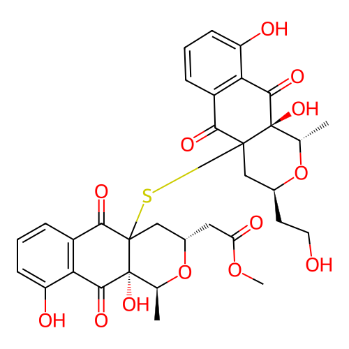 | SMILES | C[C@H]1[C@]2(C(=O)C3=C(C=CC=C3O)C(=O)C2(C[C@@H](O1)CCO)SC45C[C@@H](O[C@H]([C@]4(C(=O)C6=C(C5=O)C=CC=C6O)O)C)CC(=O)OC)O |