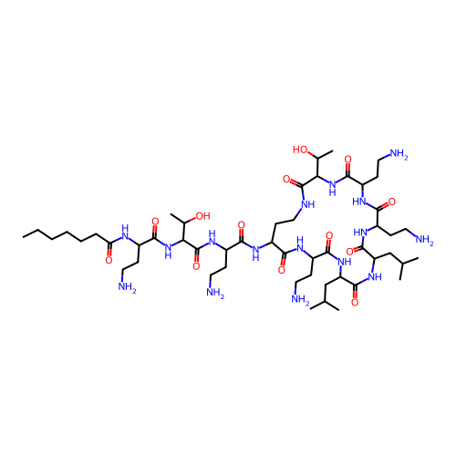 | SMILES | CCCCCCC(=O)NC(CCN)C(=O)NC(C(C)O)C(=O)NC(CCN)C(=O)NC1CCNC(=O)C(NC(=O)C(NC(=O)C(NC(=O)C(NC(=O)C(NC(=O)C(NC1=O)CCN)CC(C)C)CC(C)C)CCN)CCN)C(C)O |