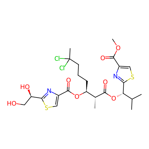 | SMILES | C[C@H]([C@H](CCCC(C)(Cl)Cl)OC(=O)C1=CSC(=N1)[C@@H](CO)O)C(=O)O[C@H](C2=NC(=CS2)C(=O)OC)C(C)C |
