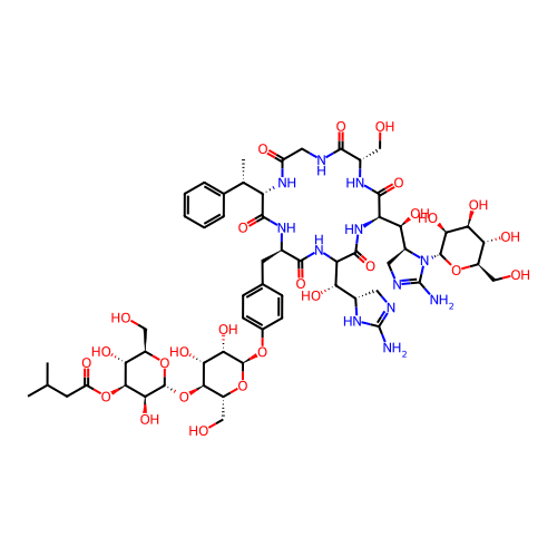 | SMILES | C[C@H]([C@H]1C(=O)N[C@@H](C(=O)NC(C(=O)N[C@@H](C(=O)N[C@H](C(=O)NCC(=O)N1)CO)[C@H]([C@@H]2CN=C(N2[C@@H]3[C@H]([C@H]([C@@H]([C@H](O3)CO)O)O)O)N)O)[C@H]([C@@H]4CN=C(N4)N)O)CC5=CC=C(C=C5)O[C@@H]6[C@H]([C@H]([C@@H]([C@H](O6)CO)O[C@@H]7[C@H]([C@H]([C@@H]([C@H](O7)CO)O)OC(=O)CC(C)C)O)O)O)C8=CC=CC=C8 |