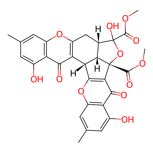 | InChI | InChI=1S/C30H24O12/c1-10-5-13(31)18-15(7-10)40-17-9-12-22-21(20(17)24(18)33)26-23(25(34)19-14(32)6-11(2)8-16(19)41-26)29(22,27(35)38-3)42-30(12,37)28(36)39-4/h5-8,12,21-22,31-32,37H,9H2,1-4H3/t12-,21+,22-,29-,30?/m0/s1 |