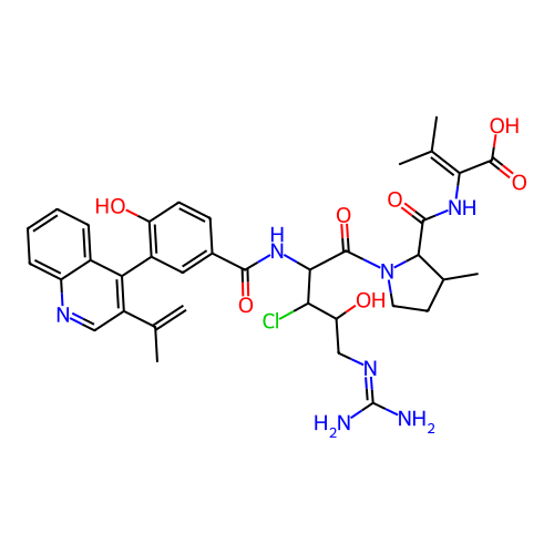 | SMILES | CC1CCN(C1C(=O)NC(=C(C)C)C(=O)O)C(=O)C(C(C(CN=C(N)N)O)Cl)NC(=O)C2=CC(=C(C=C2)O)C3=C(C=NC4=CC=CC=C43)C(=C)C |