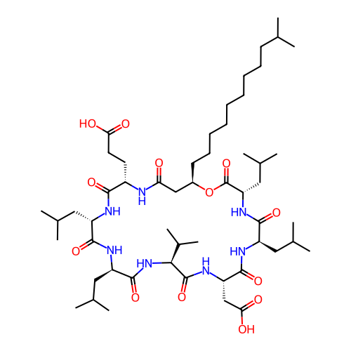 | SMILES | CC(C)CCCCCCCCC[C@@H]1CC(=O)N[C@H](C(=O)N[C@H](C(=O)N[C@@H](C(=O)N[C@H](C(=O)N[C@H](C(=O)N[C@@H](C(=O)N[C@H](C(=O)O1)CC(C)C)CC(C)C)CC(=O)O)C(C)C)CC(C)C)CC(C)C)CCC(=O)O |
