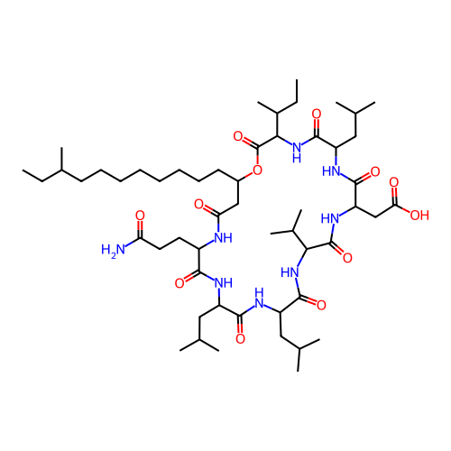 | SMILES | CCC(C)CCCCCCCCC1CC(=O)NC(C(=O)NC(C(=O)NC(C(=O)NC(C(=O)NC(C(=O)NC(C(=O)NC(C(=O)O1)C(C)CC)CC(C)C)CC(=O)O)C(C)C)CC(C)C)CC(C)C)CCC(=O)N |