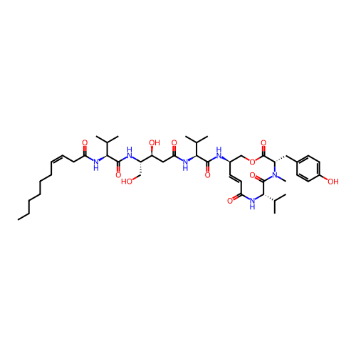 | SMILES | CCCCCC/C=C\CC(=O)N[C@@H](C(C)C)C(=O)N[C@@H](CO)[C@H](CC(=O)N[C@@H](C(C)C)C(=O)N[C@H]1COC(=O)[C@@H](N(C(=O)[C@@H](NC(=O)C=C1)C(C)C)C)CC2=CC=C(C=C2)O)O |