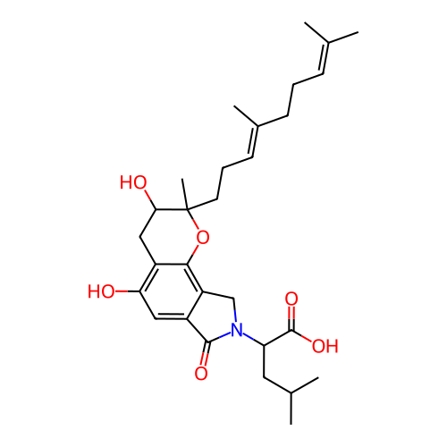 | SMILES | CC(C)CC(C(=O)O)N1CC2=C3C(=C(C=C2C1=O)O)CC(C(O3)(C)CC/C=C(\C)/CCC=C(C)C)O |