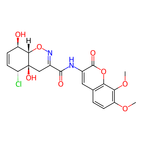 | SMILES | COC1=C(C2=C(C=C1)C=C(C(=O)O2)NC(=O)C3=NO[C@H]4[C@@H](C=C[C@H]([C@]4(C3)O)Cl)O)OC |