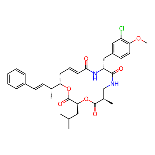 | SMILES | COC1=C(Cl)C=C(C[C@H]2NC(=O)/C=C/C[C@@H]([C@H](C)/C=C/C3=CC=CC=C3)OC(=O)[C@H](CC(C)C)OC(=O)[C@H](C)CNC2=O)C=C1 |