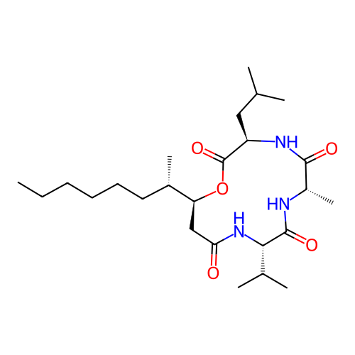 | SMILES | CCCCCC[C@H](C)[C@@H]1CC(=O)N[C@H](C(=O)N[C@H](C(=O)N[C@@H](C(=O)O1)CC(C)C)C)C(C)C |