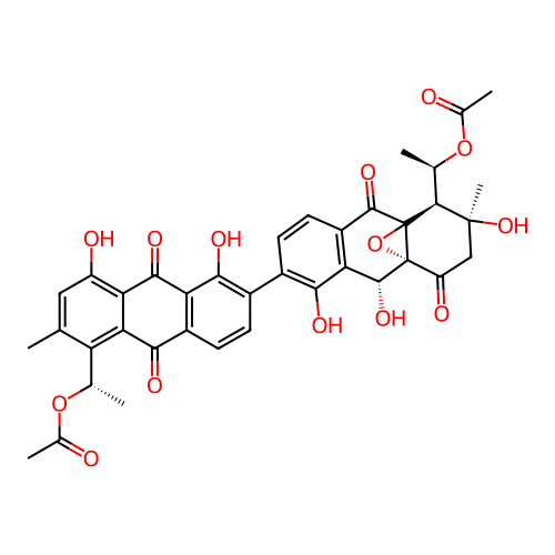 | InChI | InChI=1S/C38H34O14/c1-13-11-22(41)27-28(24(13)14(2)50-16(4)39)31(45)20-9-7-18(29(43)25(20)32(27)46)19-8-10-21-26(30(19)44)35(48)37-23(42)12-36(6,49)33(15(3)51-17(5)40)38(37,52-37)34(21)47/h7-11,14-15,33,35,41,43-44,48-49H,12H2,1-6H3/t14-,15+,33-,35+,36-,37+,38?/m0/s1 |