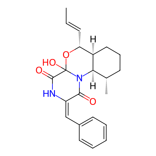 | SMILES | CC=C[C@@H]1[C@H]2CCC[C@@H]([C@H]2N3C(=O)C(=CC4=CC=CC=C4)NC(=O)C3(O1)O)C |