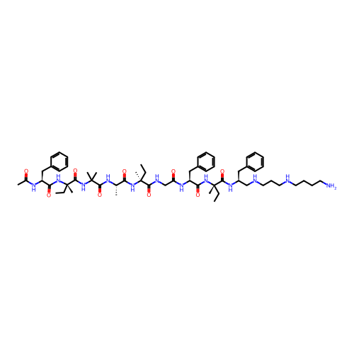 | SMILES | CC[C@@](C)(C(=O)NCC(=O)N[C@@H](CC1=CC=CC=C1)C(=O)N[C@@](C)(CC)C(=O)N[C@@H](CC2=CC=CC=C2)CNCCCNCCCCN)NC(=O)[C@H](C)NC(=O)C(C)(C)NC(=O)[C@](C)(CC)NC(=O)[C@H](CC3=CC=CC=C3)NC(=O)C |