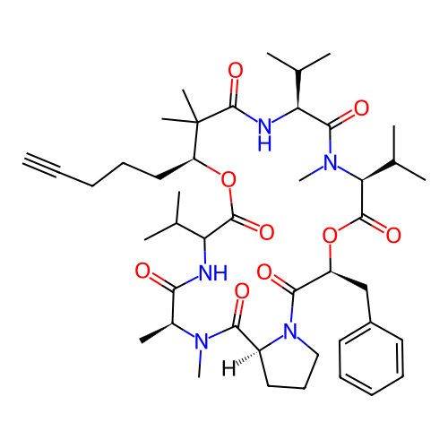 | SMILES | C[C@H]1C(=O)NC(C(=O)O[C@H](C(C(=O)N[C@H](C(=O)N([C@H](C(=O)O[C@H](C(=O)N2CCC[C@H]2C(=O)N1C)CC3=CC=CC=C3)C(C)C)C)C(C)C)(C)C)CCCC#C)C(C)C |