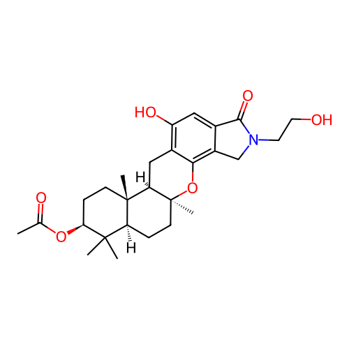 | SMILES | CC(=O)O[C@H]1CC[C@]2([C@H](C1(C)C)CC[C@]3([C@@H]2CC4=C(C=C5C(=C4O3)CN(C5=O)CCO)O)C)C |