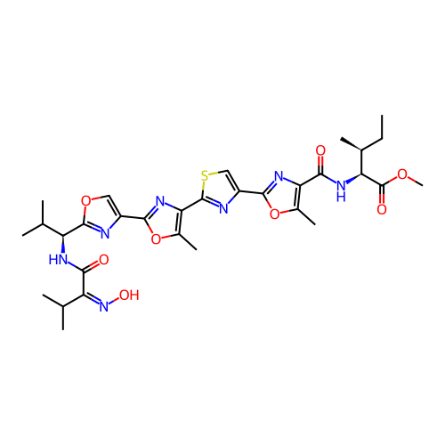 | SMILES | CC[C@H](C)[C@@H](C(=O)OC)NC(=O)C1=C(OC(=N1)C2=CSC(=N2)C3=C(OC(=N3)C4=COC(=N4)[C@H](C(C)C)NC(=O)/C(=N\O)/C(C)C)C)C |