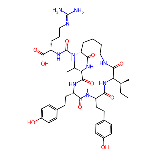 | SMILES | CC[C@H](C)C1C(=O)NCCCC[C@H](C(=O)N[C@H](C(=O)N[C@H](C(=O)N(C(C(=O)N1)CCC2=CC=C(C=C2)O)C)CCC3=CC=C(C=C3)O)C(C)C)NC(=O)N[C@@H](CCCN=C(N)N)C(=O)O |